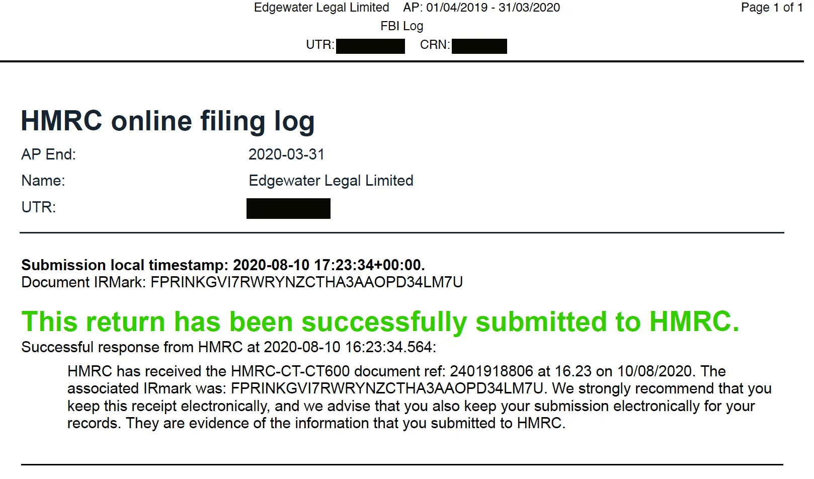 You need to confirm that the tax return has been filed with HMRC. This is an example of an electronic acknowledgment provided by HMRC: