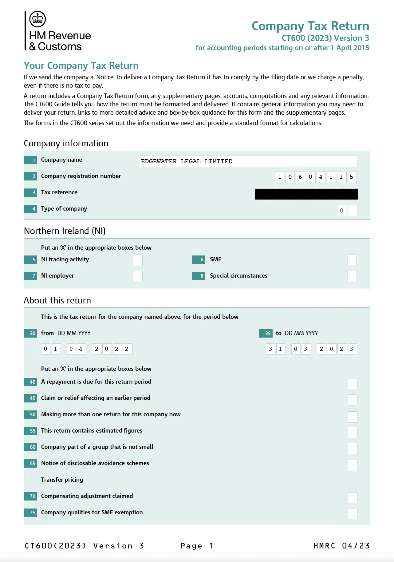 Company Tax Return CT600 for the last full financial year