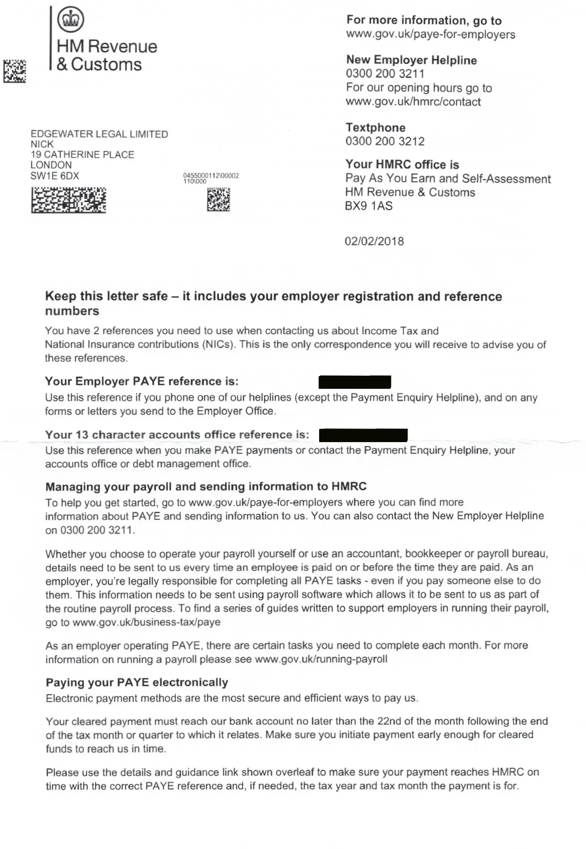 When you employ workers you are required to register with HMRC in order to deduct tax at source. The letter that HMRC used to send out looks like this:
